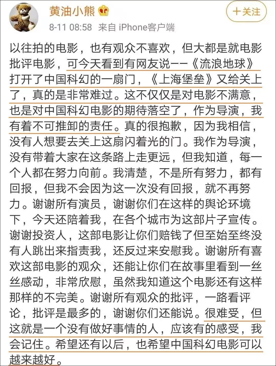 昨天上午,《上海堡垒》的导演滕华涛发文道歉:
