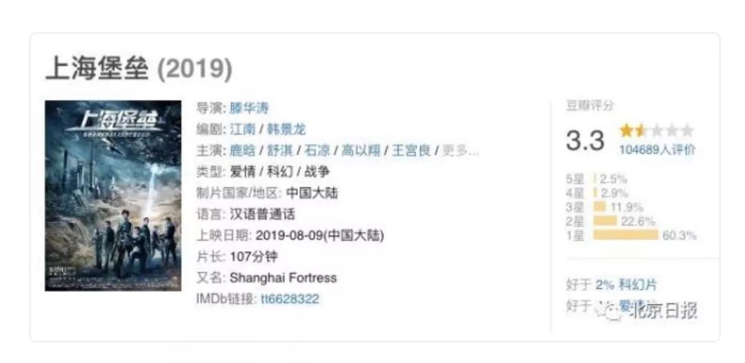 由滕华涛执导,流量小生鹿晗,影后舒淇主演的《上海堡垒》,于8月9日上映, 至今为止票房才刚刚破亿,上座率也只有4%。查看豆瓣评分也仅为可怜巴巴的3.3分。