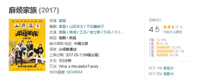2017年,黄磊首次执导电影《麻烦家族》,据悉,这部戏翻拍自日本的经典电影《家族之苦》(PS:该电影票房14亿日元,豆瓣评分8.1),然而《麻烦家族》尽管有夫妻档黄磊和孙莉,还有戏骨李立群,张伟欣,实力派王迅,海清和小鲜肉魏大勋加盟,何炅,岳云鹏友情客串,依然无法扭转烂片的骂名。