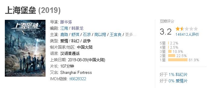 《上海堡垒》豆瓣评分从3.4分跌至3.2分,即将跟撤档停映的电影《阿修罗》持平,滕华涛遭遇从事导演工作以来最大的危机,不仅令投资人亏损严重,更被网友嘲讽关上了中国科幻电影的大门。