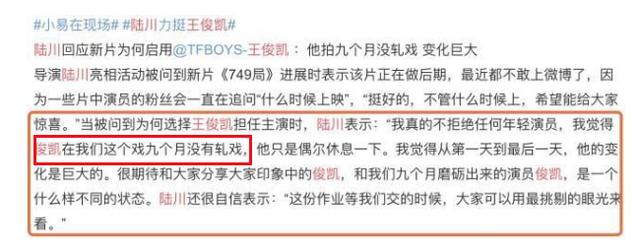 此时陆川来宣传新片《749局》,可谓正好撞在媒体枪口上,于是现场媒体记者抛出了“新片为何启用王俊凯”这样尖锐的问题。陆川力挺王俊凯的初衷可以理解,毕竟王俊凯是他这部新片的主演,可他的一句“我觉得俊凯在我们这个戏九个月没有轧戏”,却让一些影迷和网友感到费解并引发质疑:演员不轧戏是职业精神的基本要求,什么时候也成为导演夸演员的说辞了?“就好比一个学生天天上课不迟到,难道还需要表扬一下?”