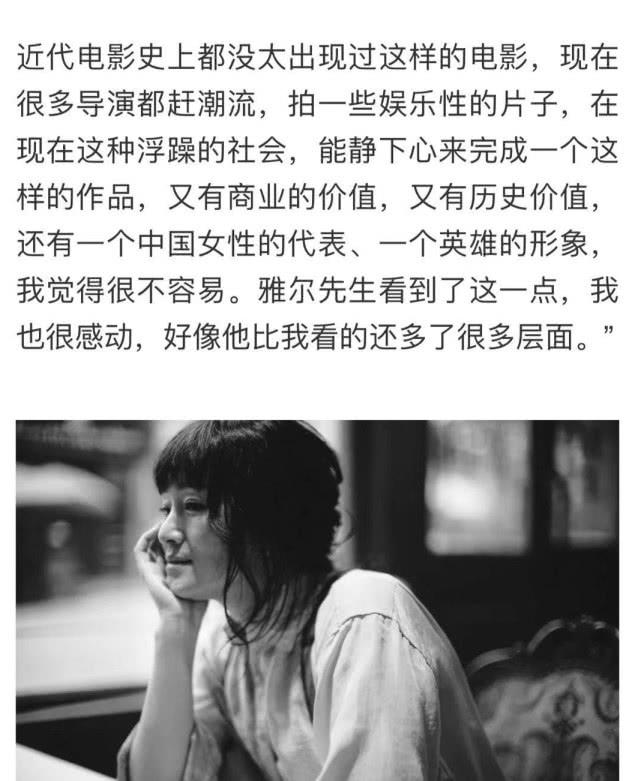 巩俐说,丈夫精准地抓住了影片的核心气质,“他说得很准确,他说到了电影的颜色,说到了框架,也谈了电影的意义,女主角的英雄形象……他看到了很多层面,觉得这部电影既有商业价值也有历史意义,他的发言让我很感动。”