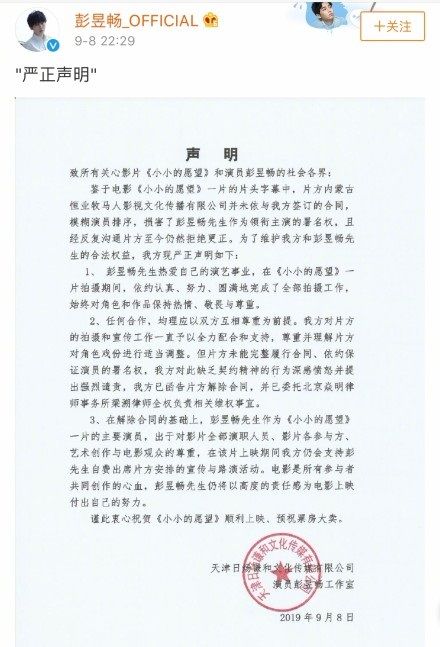 当然,彭昱畅方面也给出了回应,严厉谴责片方违反合约规定的行为,表示已经和片方解除合约等等。可见,彭昱畅原本是“男一”,对自己一下子变成了“男二”也是无法接受。