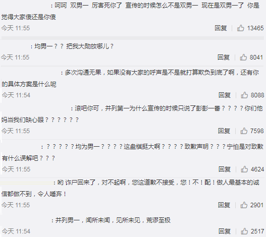 对此,男主演王大陆也发表了声明,称自己受邀出演这部戏时就说“男一”,并没有“压番其他艺人”等等。至于制片方则是声明这部戏彭昱畅和王大陆都是“男一”,并向两位演员道歉等等。