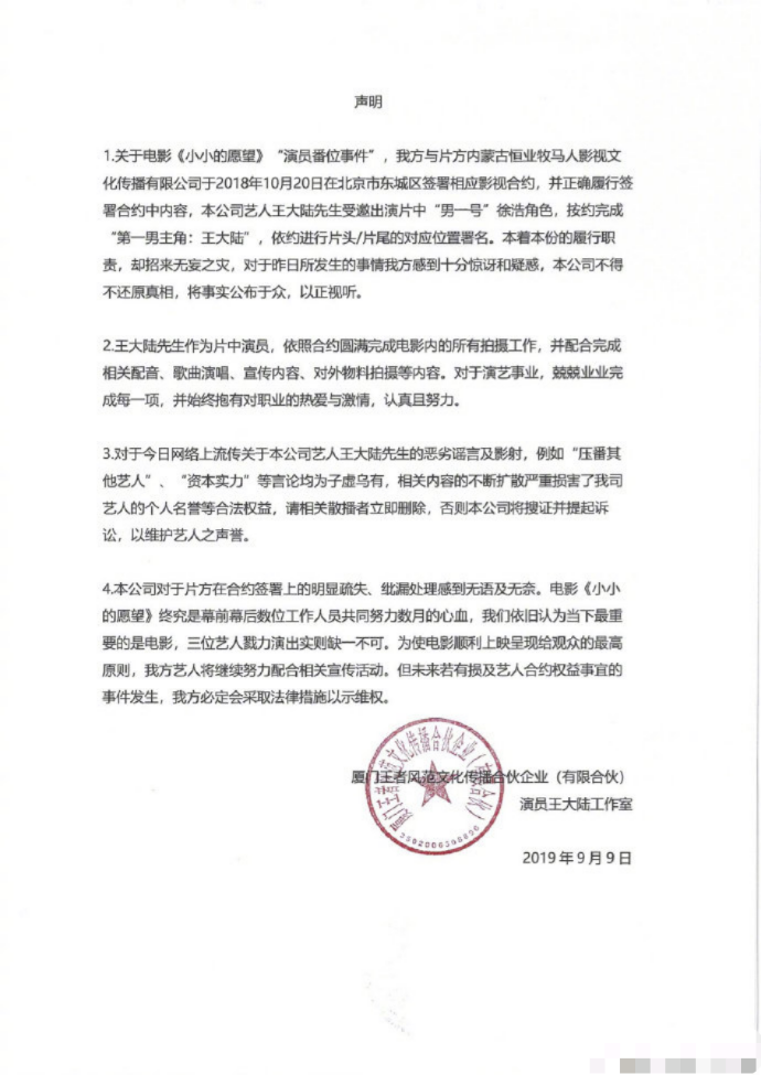 为此王大陆工作室于9月9日发出声明表示根据合约内容,王大陆先生出演片中男一号徐浩角色,依约进行片头片尾的的对应位置署名,正确履行职责,却没想到竟招来无妄之灾。