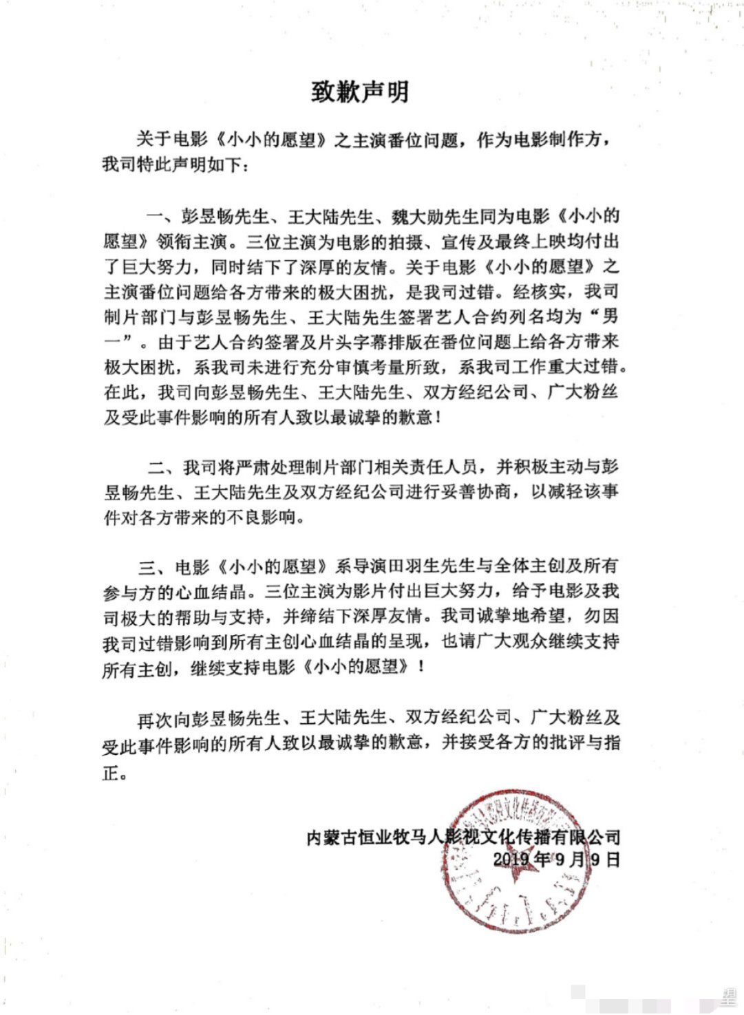 片方也于昨天中午发布致歉声明,表示彭昱畅先生与王大陆先生均为男一号,对因主演番位问题给各方带来的极大困扰感到十分的抱歉。