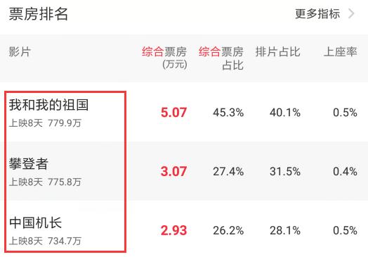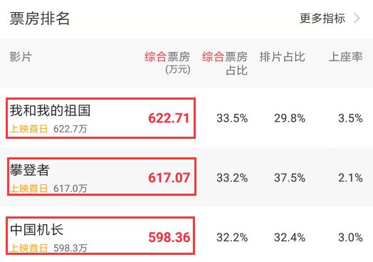 此外,这三部大片日前也都提前开启了预售模式,预售的开启标志着票房争霸正式打响!可以看到,9月30日首映日当天,《我和我的祖国》预售票房为622.7万,位居第一,《攀登者》、《中国机长》分别以617.0万、598.3万位列第二、第三,可以说咬得很紧了;三部电影的排片占比分别为29.8%、37.5%、32.4%,总共占据当天排片的99.7%,其他电影完全没有生存空间了。