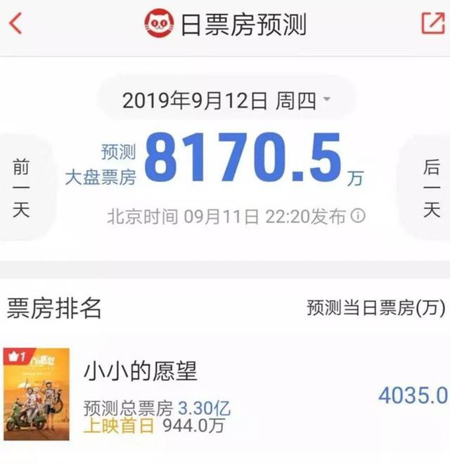 《小小的愿望》定于9月12日上映,可以说是夺得先机了,不过这部影片的上映过程也是一波三折,先是改名,又宣布撤档延期,再度定档后又闹出了“番位风波”,让期待的观众也很是心累。好在主演彭昱畅、魏大勋、王大陆等人的“兄弟情”未受影响,还在继续卖力为电影宣传。虽然猫眼票房预测显示,上映首日预售票房还不到1000万(截至9月11日晚22:20),但相信如果作品质量过硬,后期票房应该不会差。