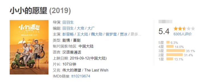 综合众多原因,《小小的愿望》评分并不好,一开始就被打了5.9分,经过一段时间后分数持续降低,当前评分为5.4 。而彭昱畅显然是不忍心自己的心血遭到更多非议,因此随后他再度发声,表示前几天的风波很抱歉,但这部电影也是自己的心血,是自己的孩子,是好电影,希望大家能多多支持。