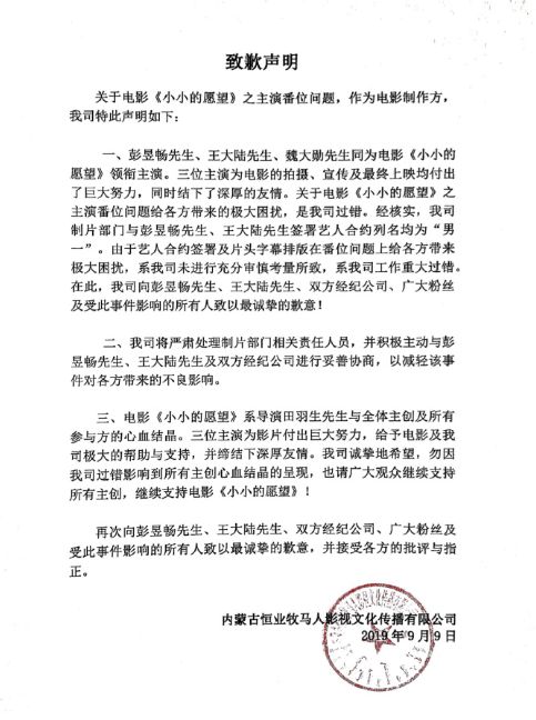 9月12日,彭昱畅、魏大勋、王大陆三人主演的电影《小小的愿望》正式上映,然而在电影上映之前,却经历了很多不愉快。原本被大家认为是男一号的彭昱畅,在宣传中直接位列第三,取而代之的是王大陆变成了男一,随后彭昱畅宣布与《小小的愿望》解约,而王大陆方面发出声明,表示当初签约时对方允诺为男一号。