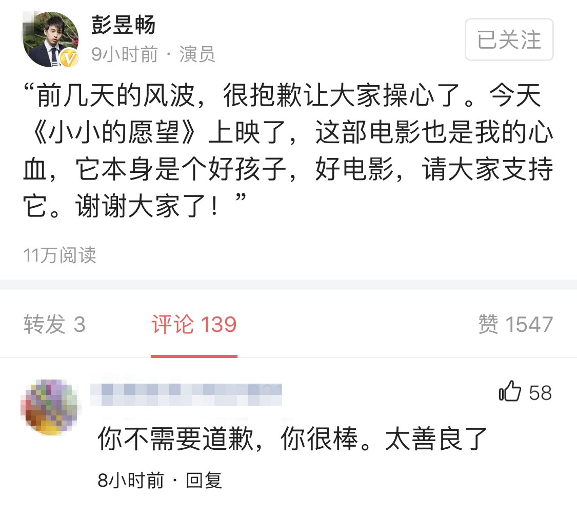 他今天甚至还发文道歉:请大家都去看《小小的愿望》。