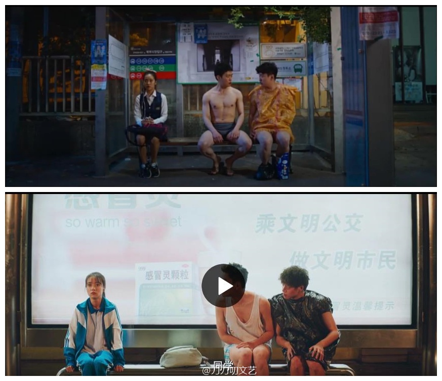 二人组在公交站台遇到小学生,一毛一样的分镜头和角色动作。