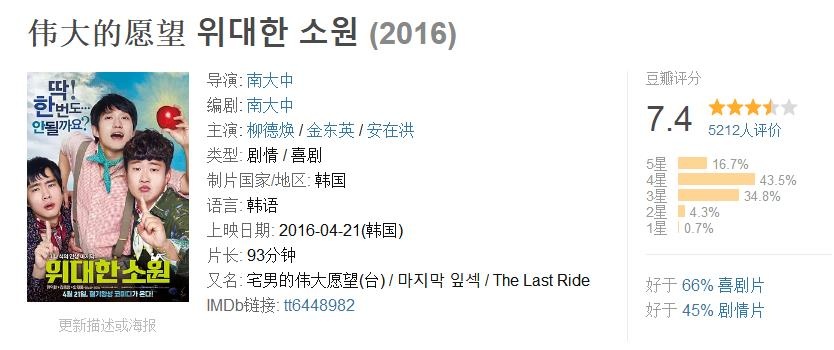 韩版的豆瓣评分并不高,7.4分,虽然有诸多小瑕疵,但不失为一部温情中带着搞笑、笑着笑着就让人哭了的及格片。