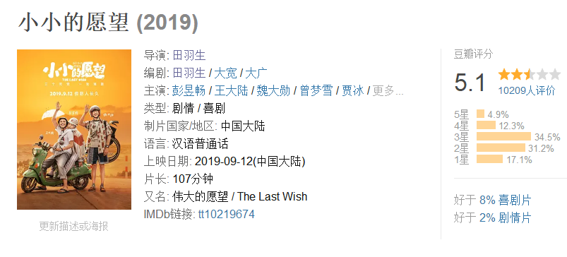 昨天,《小小的愿望》首日上映,两天之内,豆瓣评分从5.9分跌到5.1分,估计今天之内将会跌破5分。