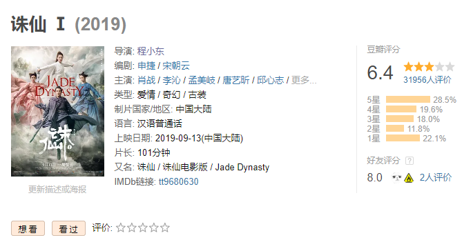 而电影在豆瓣的评分却成两极分化的情况,截止到发稿,近两万名网友为电影打分,打五星的占比28.5%,打一星的占比22.1%,需要注意的是,电影在13日早上还是6.8分,结果到了下午就掉到了6.4分,这说明打五星的多为小说及肖战的粉丝,而随着看过电影的普通观众打分增多,电影的评分慢慢下滑,由此可见,电影并没能让观众满意。