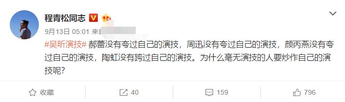 不过从程青松的发文来看,他明显是因为两个演员演技不足,却依旧买热搜吹演技感到不满,因为在喷肖战、孟美岐演技不好之前,他还直接怼了吴昕,直言真正有演技的人们没有夸过自己演技好,为什么没演技的却要炒作自己演技呢?