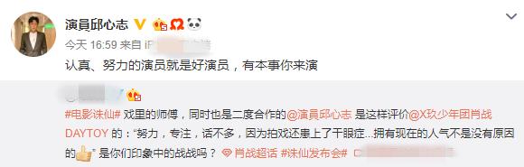 面对网络上对于肖战的负评,同剧组的演员邱心志近日仗义发声,说“认真努力的演员就是好演员,有本事你来演。”疑似怒斥某些质疑肖战的人。