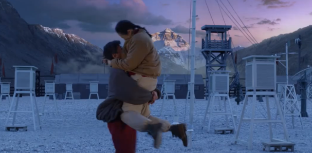 镜头中,章子怡和吴京两人穿登山服一起手牵手的画面相当唯美,尤其临近傍晚那一幕,吴京一把把章子怡抱起来转圈,而章子怡低头和他额头对额头的场景更是绝了……