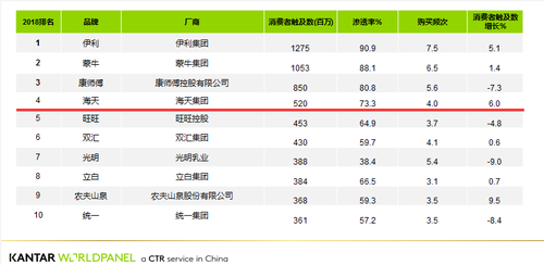 调味品行业是一个群雄逐鹿的市场。近年通过以综艺布局品牌战略,海天在市场中无疑已占上风。在凯度消费者指数2019年亚洲品牌足迹报告中,海天味业以5.2亿消费者触及数、73.3%的渗透率,位列中国快速消费品品牌第4位。