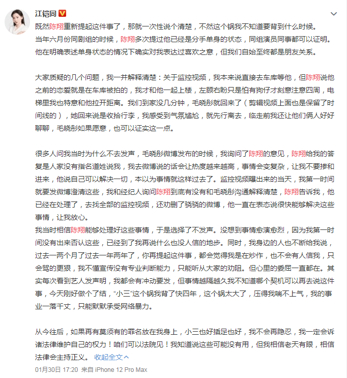 于是,毛晓彤方终于回应:真实情况与江铠同、陈翔的说法有出入,并发出两段录音材料佐证。二人当年的对话录音记录显示,虽然陈翔百般狡辩,但毛晓彤确实撞见了陈翔和江铠同在家中,并且陈翔光着膀子,瓜田李下。