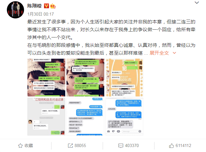 起因是近日陈翔为美女庆生的视频曝光,引发了陈翔新恋情的猜疑。于是陈翔顺势深夜发文否认自己当年出轨,附上多张与毛晓彤的对话,贴出分手时间线,同时承认新恋情。陈翔的工作人员更是对外宣称,掌握了当年陈翔被策划陷害的有力证据。