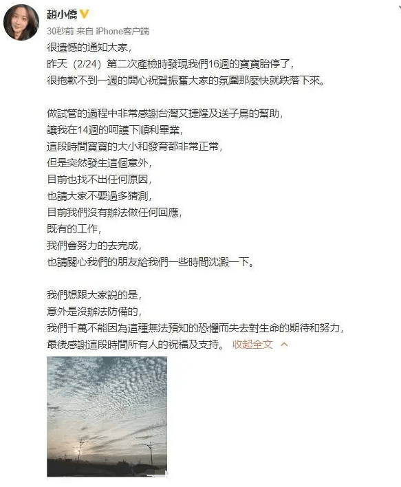赵小侨在文中提到提到,做试管成功后,宝宝的大小和发育都正常,突然发生意外,找不到任何原因,不要大家过多揣测,没有任何办法回应。