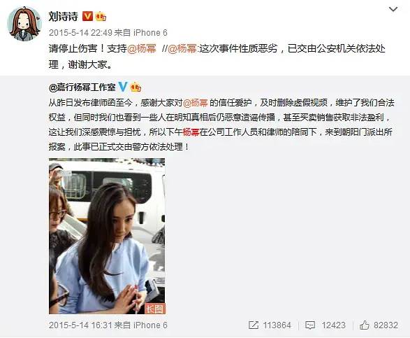 2015年杨幂被造谣小视频,刘诗诗转发帮杨幂维权。