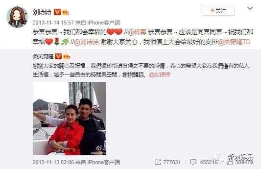 2013年11月13日这一天,刘诗诗和吴奇隆官宣恋情,同一天,杨幂和刘恺威也宣布了婚讯。