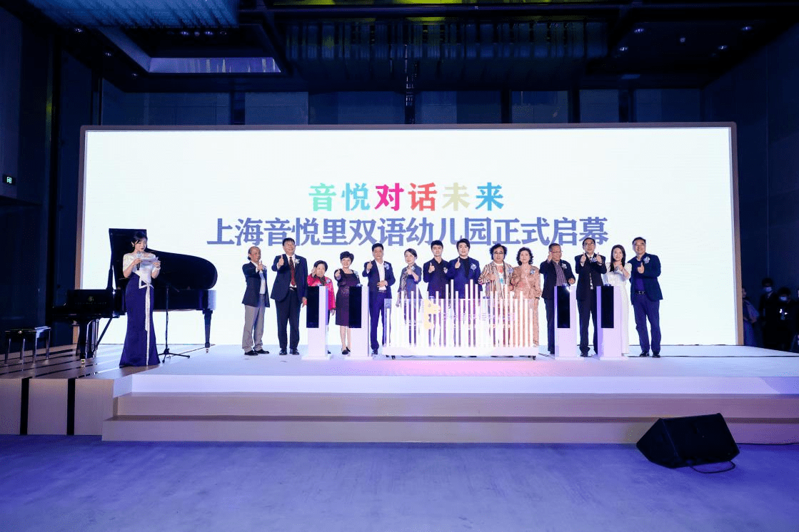 发布会现场,世界顶级钢琴大师、联合国和平大使、音悦里双语幼儿园音乐课程总顾问郎朗,上海音乐家协会理事、儿童音乐专业委员会会长、华东师范大学艺术教育部主任董放,中柏逸德集团董事长高峰,音悦里双语幼儿园董事黄建义,音悦里双语幼儿园园长高巧珍共同为音悦里双语幼儿园启幕。