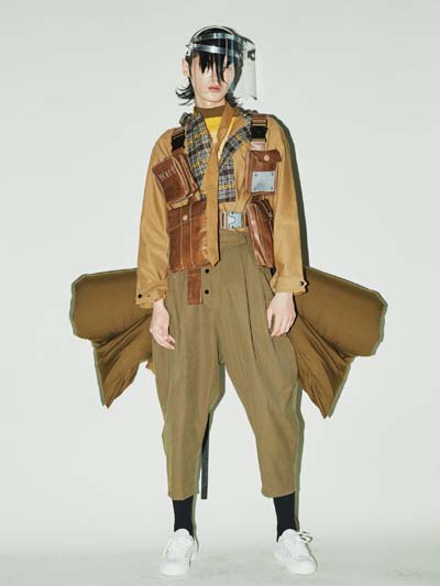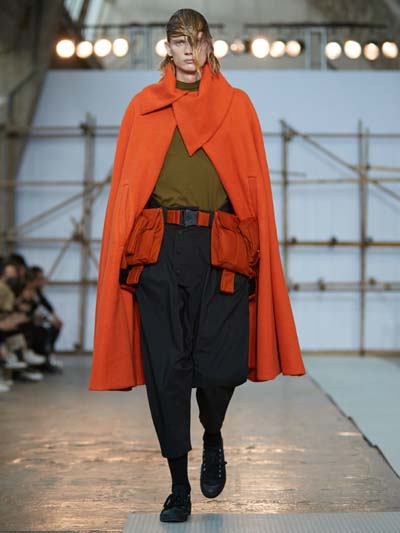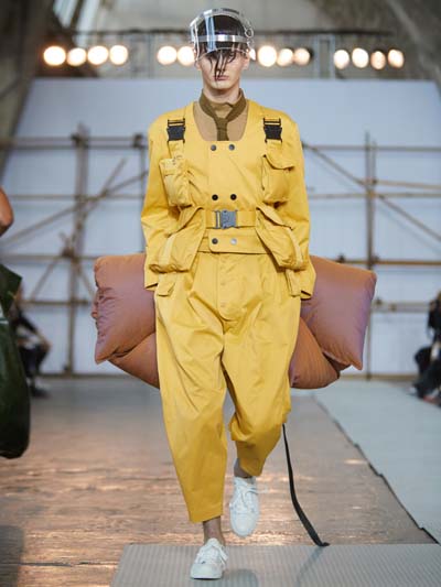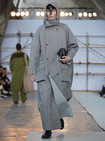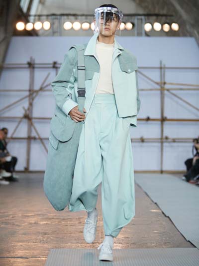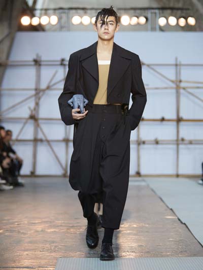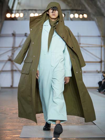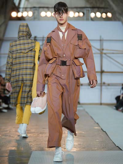 在工装的廓形中放入西装细节,将传统西装与现代休闲服装的细节揉合,模糊阶级差异化的边界…整个系列充满了强烈的反差与男性性别意象极强的元素的重新组合,以及相对遮掩得体的作务装束所带来的情趣联想。