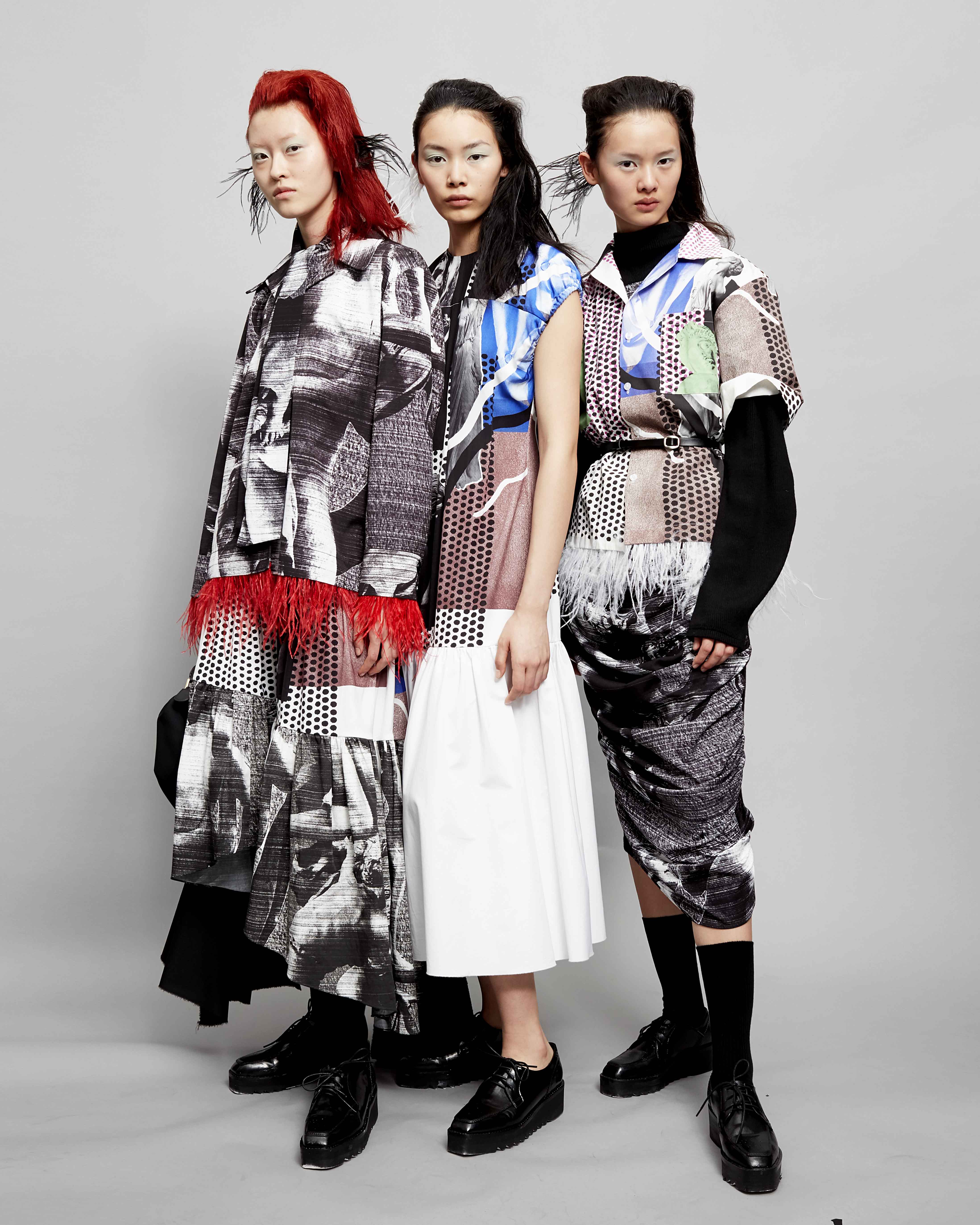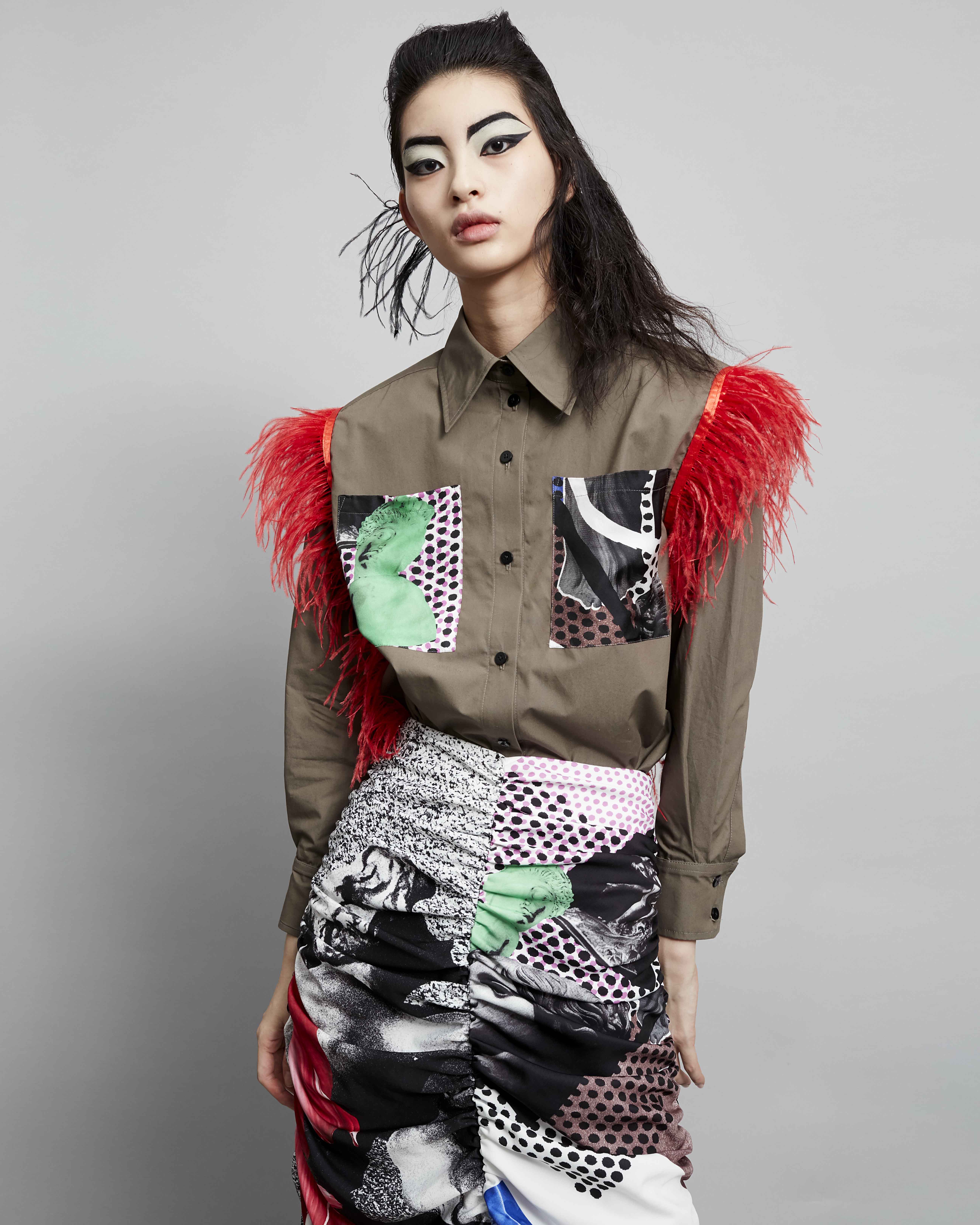 该系列的一部分灵感来自于经典的前卫人像摄影师曼雷(Man Ray)。他的作品里有种独特的沉静感。同时还有德国艺术家杰拉德﹒里希特(Gerhard Richter)的画作中遮挡与刮磨的工艺处理,结合这些灵感,我们开发出了本季的印花设计。印花中的素材来自古希腊时期和20世纪20年代的经典雕塑集。在创作印花设计时,我们决定将人像与几何图案通过色彩层层重叠,为这一古典意象带来现代感。