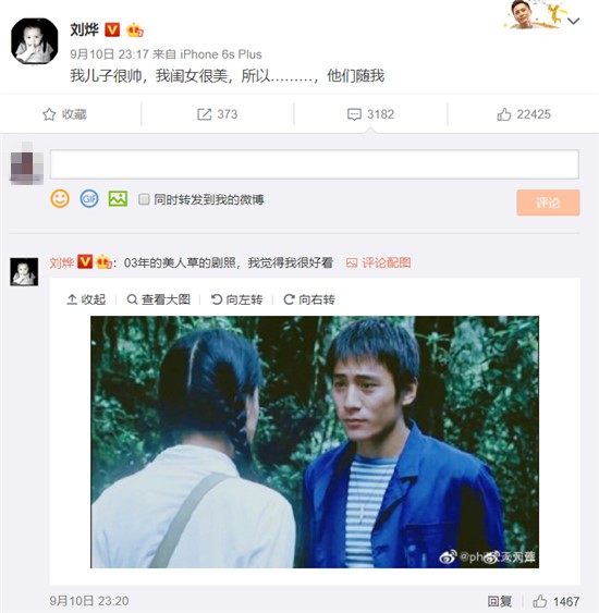 刘烨一直就很自恋,包括在家他也说过,四个人里他颜值最高。10号深夜,很久没在网上营业的刘烨又开始自恋:我儿子很帅,我闺女很美,所以………,他们随我 。不过粉丝们却很不给面子,有粉丝直接调侃应该是又喝多了。更多的粉丝是喊话想看诺一,刘烨在网上的表现也像个孩子,更像是种毫不掩饰的炫幸福,炫开心。虽然说他可以逼着俩孩子说他最帅,但是刘烨骨子里照样有一颗炫娃的心:只是他每每炫娃的姿势和别人不一样而已,就如有人说整句话前面都很有逻辑,多余的就是后面“他们随我”四个字。